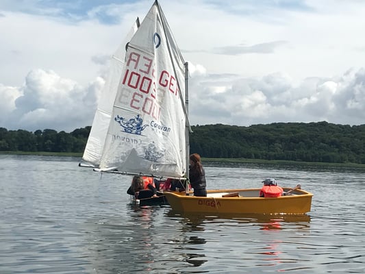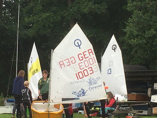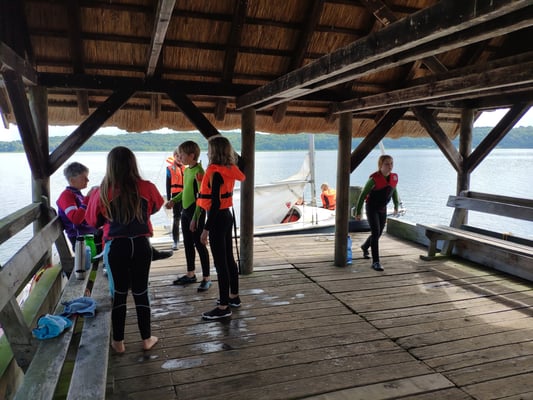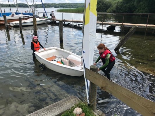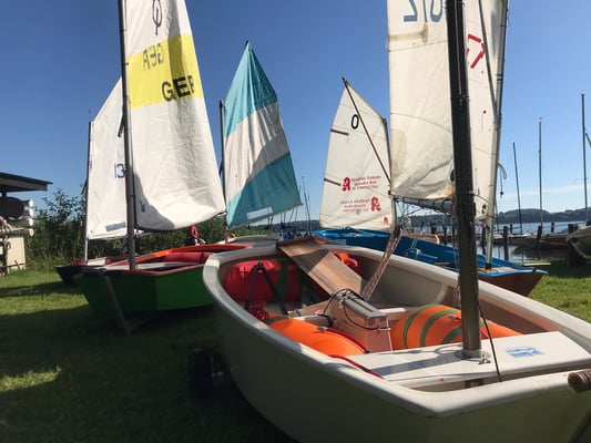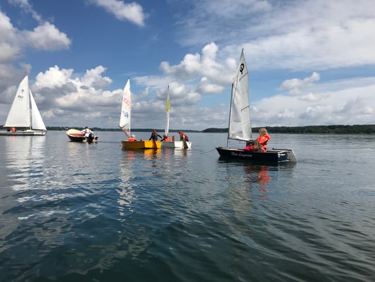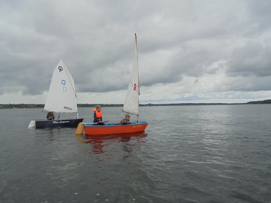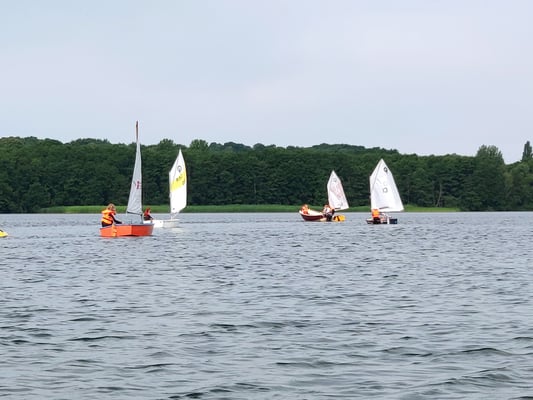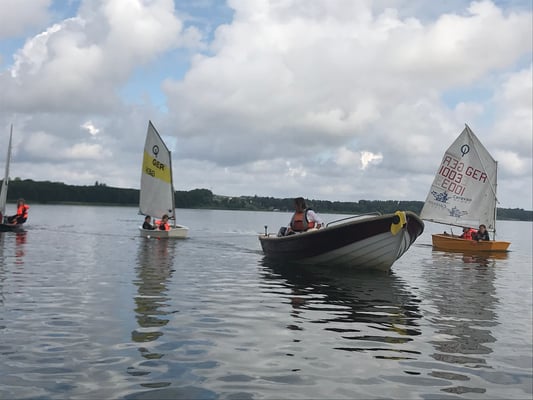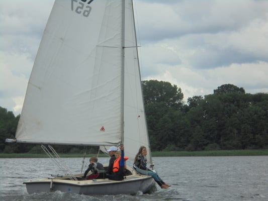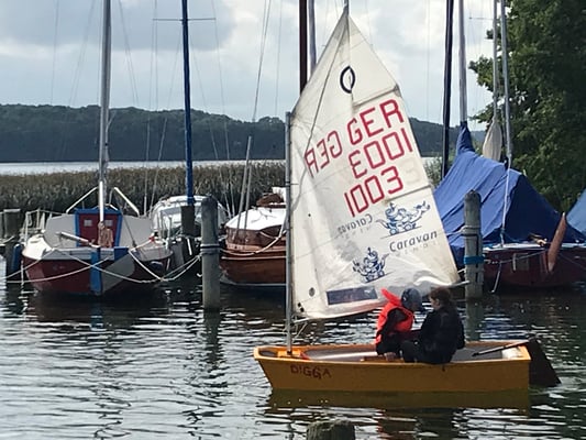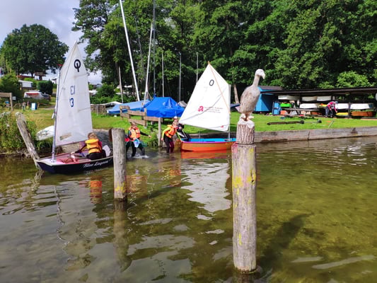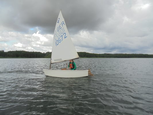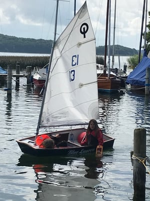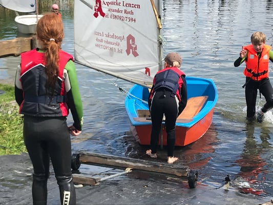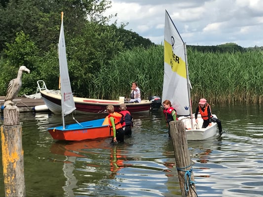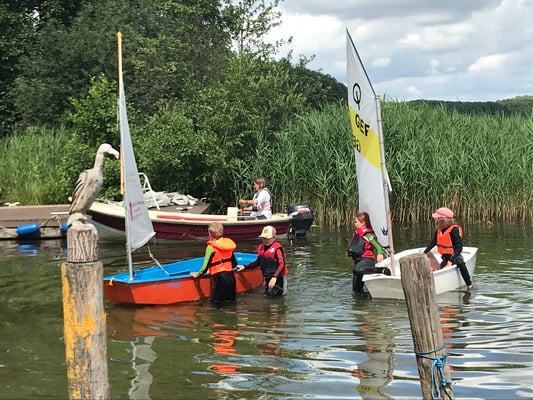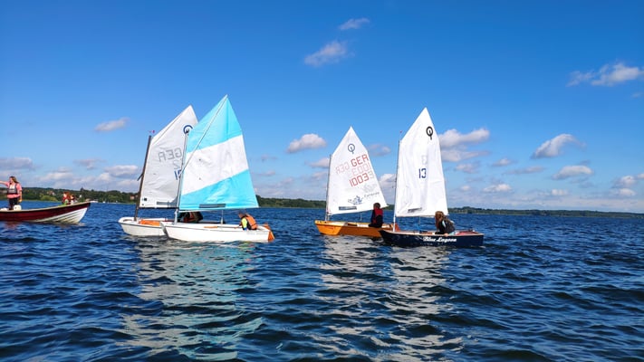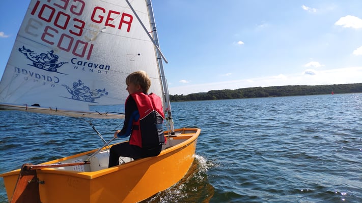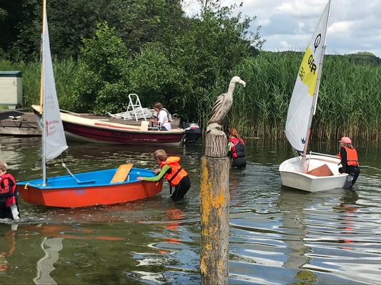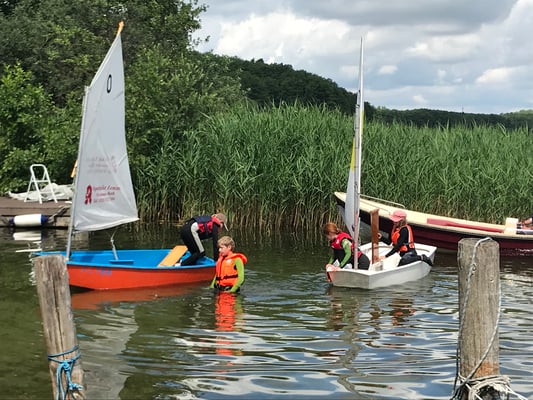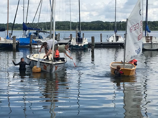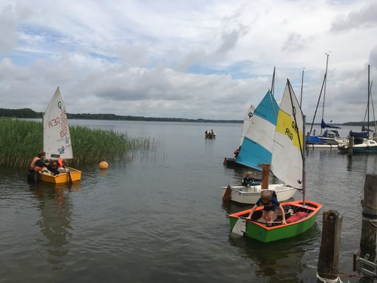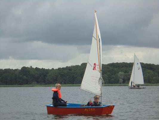 In kleinen Gruppen lernen Kinder zwischen 7 und 12 die Grundlagen der Bootsführung: Pinne halten und steuern, Segel setzen und fieren.
