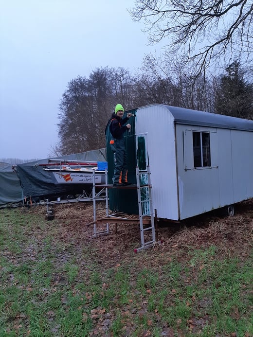 Den Bauwagen haben wir im Dezember 2021 in Berkenthin gekauft. Mausgrau war er wirklich nicht hübsch. In Laubgrün mit weißen Fensterläden und roten Geranien im Sommer sieht er schon richtig gut aus.