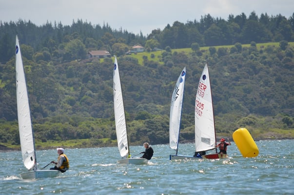 Jugendgruppe und Erwachsene bei ruppigen kalten Wetterbedingungen auf dem Wasser. Toller Nordwind, neuer Laser ist super